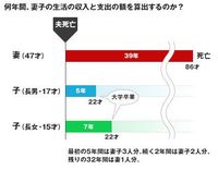 子どもがいる夫婦の場合、見直しのポイントは「夫が亡くなった後」の妻子が生きていくのにかかるお金と入ってくるお金の額だ。つまり、夫が亡くなった後、(1)妻が平均余命で亡くなるまでと、(2)子が就職するまで、の期間の(1)と(2)の総支出と総収入とを比べる(図参照)。