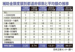 そもそも自治体による補助金の現況は、どうなのか。日本立地センターの調べによると、上の表に示すとおり補助金額は確実に増えている。また、立地企業に対してでなく、企業誘致に関する有力情報提供者への成功報酬制度を定めている県もある。さらに、留置を狙ったユニークな方策として、小規模の設備投資を積み重ねることで、一定の要件を達成すれば補助の対象とみなすマイレージ制度の導入も見られる。熱心な自治体は、さまざまな工夫に努力を傾けているのである。