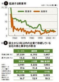 図1:低迷する開業率/図2:設立から3年以内の企業で存続している会社の数と黒字化の割合