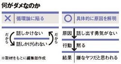 問題を解決すること、つまり、「黙る」あるいは「余計な話をする」という行動を改善することができれば、この悪循環を断ち切ることができるのです。自分の行動を修正するためには、どうしたらいいのか。「ビデオカメラ」で客観的に自分の行動を撮り、「誰もが認めることのできる行動の事実」を認識してはどうでしょうか。自分の行動をビデオで撮影してもらいます。次に、自分の行動の悪い部分を、周囲の人に指摘してもらいます。これを行動のモニタリングと言います。そして、良い行動の見本をひたすら練習します。これを行動のリハーサルと言います。