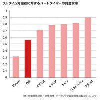 グラフは、フルタイム労働者に対するパートタイマーの賃金割合を、国際比較したものです。日本が50%強であるのに対して、同一労働・同一賃金の思想が浸透しているヨーロッパ諸国は70%~90%程度となっています。アメリカが極端に低いのは、レストランのウェイトレスやホテル従業員など、賃金以外に客からのチップ収入が加算される職種が多いためと思われます。ちなみに、これまで日本やアメリカでは、雇用形態における賃金格差を禁止するような法律が、明確に定められてきませんでした。