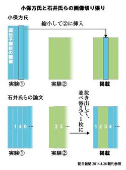 またSTAP論文の検討を行うために設けられた調査委員会の石井俊輔委員長が責任著者になっている論文でも、やはり切り張りして画像の順番を入れ替えていた。石井氏は「オリジナルデータはすべて保存してあり、問題はない」としているが、この件を受けて調査委員長を辞任した。図2は朝日新聞による説明図である。小保方氏は黒、石井氏は白という区別はきわめてあいまいである。