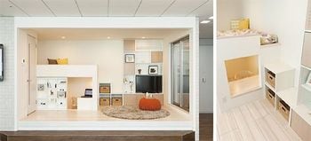 そしてもう一つ、本社に展示してあるのが、さらにコンパクト化を究めた「Fusion」のモデルルームだ。これまで未利用だった1階の床下などに着目し、空間を立体的に活用。わずか21平方メートルほどのスペースを快適性と機能性を併せ持った空間へ拡張している。