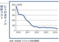 IT企業が遺伝子に注目するようになった理由は主に2つある。まずは「急速な価格低下」だ。遺伝子解析機器の性能は年々向上しており、解析費用は右肩下がり。10年前には20億円近くかかっていたヒト一人の全ゲノム解析費用は、近年は数十万円まで低下(右グラフ参照)。今年1月には遺伝子分析機器大手・米イルミナ社が、1000ドル(約10万円)で全ゲノム解析できるシークエンサーを発表し、話題となった。スニップ(ゲノムのなかで個人差がよく見つかる部分)だけを解析するならさらに費用は安い。その結果、企業が遺伝子解析を一般提供できるようになったのだ。
