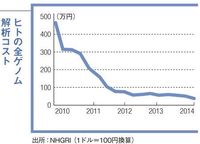 そして、米国での動きが先行していることは言うまでもない。米グーグル創業者夫人が創業し、グーグルも出資する23アンド・ミーが一般向けの遺伝子解析サービスを開始したのは、2007年のこと。当初999ドルだった費用も、一昨年末には99ドルまで引き下げてテレビCMも開始。顧客は50万人を突破した。女優のアンジェリーナ・ジョリーが「BRCA1」遺伝子解析で「乳がんになる確率が87%」と診断され、乳腺切除手術を行ったことも話題となった。