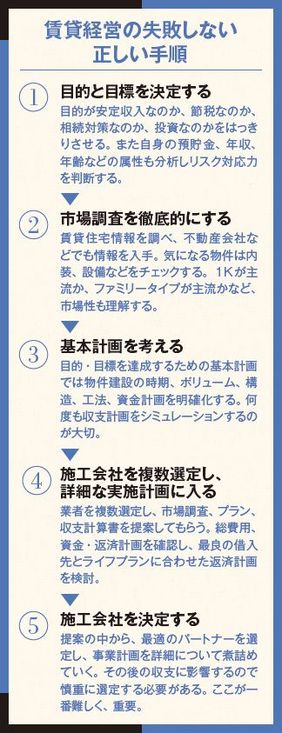 【小野】土地オーナーのなかには、不動産セミナーなどを活用し、自分で主体的にやっている方はいます。また「失敗しない正しい手順」の「(2)市場調査を徹底的にする」なども、住宅・不動産の情報サイトを使えば、相応のデータを得ることが可能。実際に自分で周辺を見て回り、不動産屋さんに聞いてみるとか、個人でできることも多い。もちろん不動産会社やハウスメーカーから情報を得てもいいし、当社のような第三者機関を使ってもいいでしょう。いずれにしても、確かな情報、データがあってこそ、「(3)基本計画を考える」ことが可能になります。