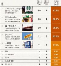 1位スターバックスコーヒー、2位モスバーガー、3位ロイヤルホストと、カタカナ名の洋食系チェーンは好感度が高いが、餃子の王将、なか卯、和民、松屋といった漢字名称の和食・中華チェーンは不支持率が高い。女性が一人でも入りやすい店は評価が高く、入りにくい店は評価が低いようにも見える。漢字系のなかでは大戸屋の健闘が目立っている。
