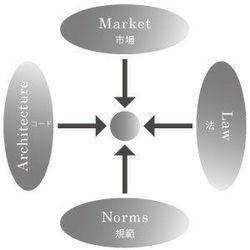 2001年に書いた『CODE』(翔泳社)で、私たちの行動を規制する4つの要因を上げ、下のように図示した(英語でコードというと、モールス・コード、文字コードなど信号を意味する場合もあれば、ハムラビ法典などの法典、法律、規範をさす場合もある。コンピュータの世界では、プログラムやアルゴリズム、アーキテクチャーなどもコードと呼んでいる)。