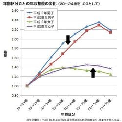 逆に女子社員は年齢格差が拡大しています。とはいえ、これまで30歳以降は年収が低下傾向にあったものが、いくぶん改善している程度です。