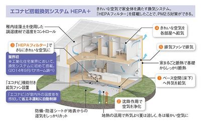 パナホームは創業当時より“きれいな空気”にこだわり、換気技術を培ってきた。同社がエコプロダクツ大賞(2012年)受賞の換気技術の進化形としてつくりあげた「エコナビ搭載換気システムHEPA+(プラス)」は、業界初となる「HEPAフィルター」を搭載。このHEPAフィルターは、花粉や黄砂はもちろん、PM2.5や、より危険とされるPM0.5にも対応。0.3マイクロメートルの微粒子を99.97%除去してくれる。ベースの空間から取り入れた新鮮な空気を、さらにフィルターに通して家全体にきれいな空気をめぐらせる。