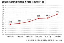 男性と比べた女性の給与は、25年前の約60%から約70%へと確実に縮まってはいるものの、未だに7割の水準に留まっています。1985年の男女雇用機会均等法改正をきっかけとして、さまざまな取り組みがなされてきたことは事実です。しかしながら、あれから四半世紀が経った現在においても、この歴然とした賃金差が存在しているのです。ちなみに、欧米諸国が80~90%程度ですので、国際比較においても顕著となっています。