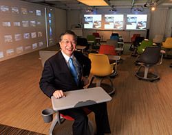 東京・中央区にある内田洋行の本社ビル7階。エレベータを降りると、そこには“未来の学習空間”が出現する。同社が「フューチャークラスルーム」と呼ぶICTを駆使した教室だ。小中学校の教室と同じスペースには、カラフルなファニチャーが並び、よく見るとデスクにタブレット型情報端末をセットできるように工夫されている。三方の壁は電子黒板やスクリーンになっていて、タブレットの画面もそこに投影できる。