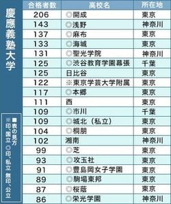 その慶應大の一般入試合格者ランキングは、繰り上げ合格者1450人を含んだもので、トップは昨年2位から巻き返した開成で206人だった。2位は昨年の3位から順位を上げた浅野で143人。3位が昨年トップの麻布で137人となった。慶應は神奈川に日吉、矢上、湘南藤沢の3キャンパスがある。地元ということもあって浅野は慶應大に強い。