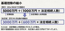 相続にまつわるトラブルは、今後さらに増加する可能性がある。15年1月以降の相続分から相続税が増税されるからだ。とくに影響が大きいのは基礎控除の縮小(図参照)。これにより、相続税の申告対象者が急増する見込みだ。都市部では“財産は自宅だけ”という場合でも、相続税とは無縁ではいられなくなる。