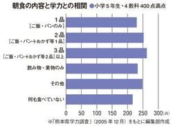 それを裏付ける次のような調査もある。熊本の小学5年生を対象に朝食メニューと学力の相関を調べたところ、最も点数が低かったのは「何も食べていない」と回答した子供たちで、400点満点中216.7点。注目したいのは、朝食を食べてきた子供たちだ。朝食が「1品」の子供たちは230.0点、「2品」は252.5点、「3品以上」は262.8点というように、品数が増えるにつれて点数もアップしている(「熊本県学力調査」2005年実施)