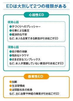 EDといっても、その原因はさまざま。「心因性」と「器質性」に大別するこ とができ、さらに「心因性」は「現実心因」「深層心因」に分かれる。