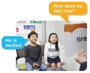インターナショナルコースのレベル1(英検5級程度)のクラスでは、石塚日向太くん(6歳)と、佐枝梨香ちゃん(7歳)がレッスン中。カードを使った会話練習や英語の歌に合わせたアクティビティなど、元気いっぱいに英語を発しているのが印象的だ。