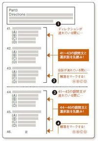 リスニング・セクションは、会場に流される音声とともに進行する。ここで重要なのは、設問を読み、音声を聴き、選択肢を読み、正解にマークするという作業を、一定のリズムでこなしていくこと。そこでポイントとなるのが、設問文と選択肢の“先読み”だ。