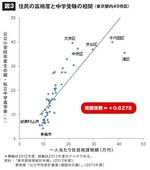 中学受験の進行に地域的な偏りがあることが分かりました。国・私立中学進学率の伸びが大きい地域は、富裕層が多く住んでいる地域であることは言うまでもありません。最近のデータでみると、住民の富裕度と中学受験をする子どもの量は、非常に強く相関しています。図3にみるように、住民税の課税額が高い地域ほど、国・私立中学進学率が高い傾向が明瞭です。相関係数は+0.8278にもなります。大変高い値です。
