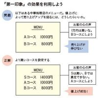 例えばある中華料理店に、1万円のAコースと、8000円のBコースがあったとする。この2つを比べると、Aコースは高いと感じる顧客が多いだろう。そこで、新たに1万4000円のSコースを設定して、メニューのトップに持ってくる。すると、Sコース1万4000円がアンカーとなって、Aコース1万円が安く感じるようになる。これがアンカリング効果だ。