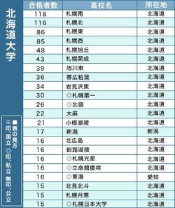 北海道大以外にも東京大10人、京都大12人、東北大18人、大阪大6人など道外の難関大にも数多くの合格者がいる。
