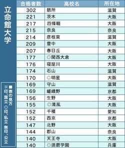 今春の高校別合格者数ランキングを見ると、トップは前年を26人上回り302人となった膳所。同校は12年まで17年連続でトップを続けてきたが、昨年は茨木に抜かれ2位だった。茨木は前年から55人減の221人で2位に下がった。びわこ・くさつキャンパスがある立命館大は、膳所以外にも5位に214人(4人減)の彦根東、10位に174人(19人増)の石山、12位に169人(43人増)の守山といった滋賀の高校3校がランクインしている。