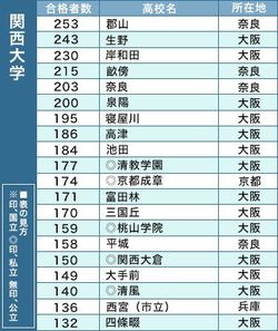 関西大の高校別合格者数ランキングは、昨年3位だった奈良県の郡山が合格者を64人増やして253人となり、2年ぶりの1位になった。奈良県の公立校では奈良や畝傍に次ぐ進学校で、今春の難関大合格実績は、京都大1人、大阪大17人、神戸大20人などの国立大に加え、私立大も同志社大123人、立命館大144人、関西学院大54人などとなっている。
