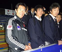 試合後、「第一段階のノルマは達成できました」と喜びながら、魚住監督が説明する。東京都立桜町高校教員の38歳。