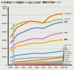 図に示されているように、東南アジア諸国の1人当たりGDP(購買力平価ベース)は、2012年においてシンガポールが最高で6万1803米ドルである。タイは1万0757米ドル。ちなみに中国が9210米ドルであるから、タイのほうが若干高い。これらに対して、カンボジア、ラオス、ミャンマー、ベトナム(CLMV)については、12年において、カンボジアが2505米ドル、ラオスが2925米ドル、ミャンマーが1801米ドル、ベトナムが3998米ドルである。CLMV諸国はタイの一人当たりGDPの5分の1から3分の1程度しかない。