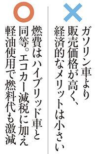 後処理装置が不要な分コストも安く、低価格の小型車に搭載しても価格競争力を維持できる。たとえば、先日、日本カー・オブ・ザ・イヤーを受賞した同社のデミオのディーゼル仕様車の場合、同じ車種のガソリン仕様よりはやや高いが、トヨタのハイブリッド車アクアとはほぼ同等の、180万~200万円弱。エコカー減税(自動車取得税および初年度の重量税を全額免税。デミオの場合6万7000~7万2400円)の対象で、クリーンディーゼル補助金(同1万~5万円)も受けられる。
