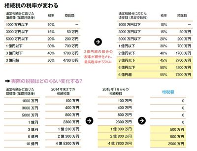 今回の改正では、相続税の税率も改定される。2014年末までは取得価格に応じて10%から50%の税率が適用されるが、15年1月1日からは、最高税率が55%に引き上げられる。また、税率区分が細分化されるため、法定分の相続財産が2億円超の場合には、増税になる可能性がある。