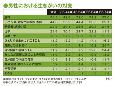では、あなたにとっての生きる喜び、張り合いとは、どんなものだろうか。ある調査によれば、成人男性の結果は下のとおりだ。35歳から74歳まで幅広い年齢層を調査しているが、結果はどの年代もおおよそ同じ。全体としては1番が「趣味」で、2番が「子ども・孫・親などの家族・家庭」だ。