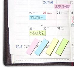お勧めなのは、25×7.5mmサイズの赤、青、黄、緑の付せんが入った「ポスト・イット スリム見出しミニ」(3M)です。私の場合、「黄が普通」「青が重要」「赤が注意」「緑がプライベート」として使っています。小さな付せんですので、メモするときは手帳にメモするのと同様、自分がわかる範囲で省略すればいいでしょう。たとえば、「12月22日15時からプレジデント社で打ち合わせ」という仮予定をメモするなら「プレ打15時~」とし、12月の月間スケジュール欄の22日に貼っておけばいいのです。