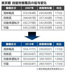 たとえば、東京都が2008年に発表した「技能労務職員等の給与等の見直しに向けた取組方針」という資料があります。都の公務員と民間企業従業員の平均給与について、ほぼ同じ職種ごとで比較を試みています。