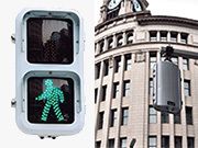 2006年に発売。現在、歩行者用信号灯機で全国シェア30%、累計7万8000灯を設置。サイズ縦約700mm・横約370mm・奥行き・約200mm。重さ約9kg。従来の信号機の約70%の軽さを実現した。写真右は銀座4丁目和光前の信号。そのほか、全国に設置されている。