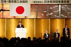 冒頭、経団連会長の榊原定征は「昨年暮れの総選挙でも自民党・公明党の連立与党が3分の2の議席を確保しました。これは国民がアベノミクスをはじめとする安倍政権の政策を支持する、継続を求める、今後の成果を期待するという現れ。経済界としてもデフレ脱却、経済再生の取り組みを迅速かつ強力に推進する政治の体制が整えられたことを大いに歓迎する」と挨拶。「デフレ脱却と経済の好循環の2巡目をまわすために、積極経営を通じて、企業収益を拡大させる、設備投資、雇用の拡大につなげて、さらに賃金の拡大を図っていかなければならない。今年は政官民がそれぞれまなじりを決してデフレ脱却に取り組む、確実に実施する年にしなければならない」と激を飛ばした。