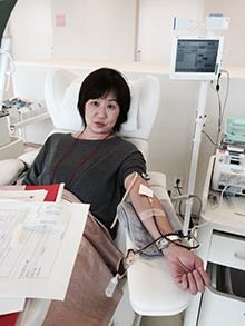 スカイツリーの東京ソラマチにある「献血ルームfeel」にて採血される著者。