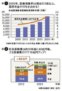 図1 社会保障費は約10年後に40兆円増。うち医療費だけで19兆円アップ!/図2 2050年、医療保険料は現在の2倍以上、国民年金の15%を占める!