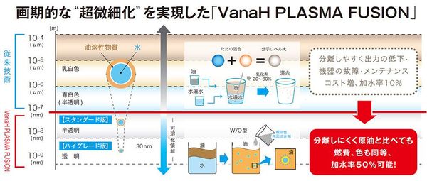 「当社は、水素イオン化・炭素イオン化の実現による超微細化液体の反応技術を開発し、『VanaH PLASMA FUSION(バナエイチ・プラズマ・フュージョン)』と名づけました。この技術によって、油と水の混合というレベルを超えた、ある種の融合状態を実現し、従来のエマルジョン燃料に見られた分離を回避することが可能になったのです。添加剤の研究も重ね、わずか0.5~1.0%の量に抑えることができました。そのうえ重油、軽油、灯油、バイオディーゼル燃料のどれについても、加水率約50%を可能にしたのです」