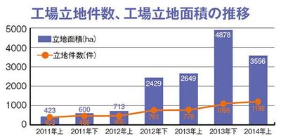 そして経済産業省発表の工場立地動向調査。これについても、14年上期の調査結果は件数で前年同期比53.7%増、同じく面積で34.3%増だ。さらに下のグラフを見れば、ここ数年、回復していることがよく分かる。