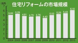 日本のリフォーム市場は緩やかに拡大しつつある。2013年の住宅リフォーム市場規模(増築・改築工事費及び設備等の修繕維持費の合計)は、6兆1000億円(前年比112%増)に達した(グラフ参照)。消費増税を前にした駆け込み需要が市場を押し上げた側面もあるが、背景には、長らく新築中心とされてきた住宅観の変化がある。日本の住宅ストックは約5760万戸と、すでに国内の世帯数を15%上回っている(08年時点)。人口が減少に向かう中、住まいの“数”はすでに充足しつつある。次に問われるのは、既存の住宅ストックを生かしながらその“質”を高めるリフォームの技術とアイデアだ。