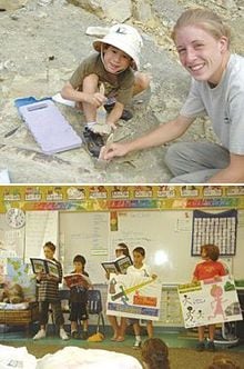 上:古生物学研究者とアロサウルスの化石を発掘(6歳)下:グループ研究で創作小説を発表(8歳)