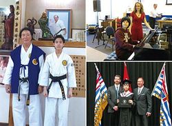 左から時計回りに、5歳から始めた空手で初段に昇段、3歳から始めたピアノでショパンを演奏、高校の卒業式(すべて14歳のとき)