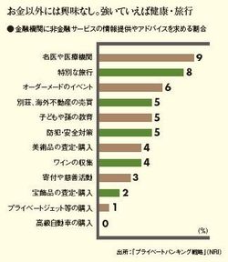 超富裕層を対象にしたNRIのアンケートでは、「特別な旅行」や「オーダーメードのイベント」「別荘、海外不動産の売買」に興味を持つ人が多かった。日本の富裕層は趣味や娯楽には重きを置かないといわれるが、海外への旅行や滞在には関心が高いということだ。
