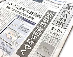 例えば、今朝(3月9日)の日経新聞のトップ記事は「部品供給、復旧すばやく」というもので、トヨタ自動車が災害発生時に、自動車生産に必要な部品の供給を確保するために、10次下請けまで含め1万3000社を対象に情報網を構築し、サプライチェーンを確保しようというものです。災害を受けた工場などの代替の供給者を素早く確保し、自動車生産を滞らせないというものです。