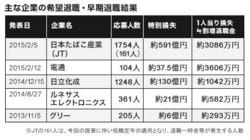 図表は、近年発表された主要企業の希望退職や早期退職の結果です。特別損失の中には、再就職支援会社との契約料(1人当たり平均100万円程度)なども含まれますが、その大半は割増退職金と考えてよいでしょう。したがって、1人当たり特別損失額を算出すれば、ほぼ割増退職金の平均水準ということになるのです。