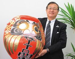 群馬県高崎の名産品のだるまを持って。
