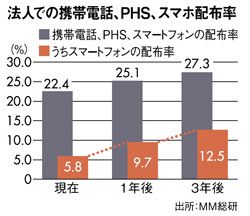 MM総研の調査によると、企業内の携帯電話、PHS、スマートフォンを合わせた従業員配布率は22.4%で、そのうちスマホの比率は5.8%だった。3年後の17年でも、スマホの割合は12.5%に留まる。