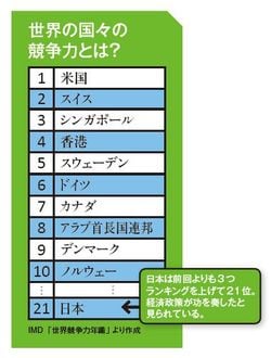 この背景には、本格的な人口減社会の到来などを要因とする経済規模の縮小、それに伴う国際競争力低下への懸念がある。毎年、IMD(国際経営開発研究所:International Institute for Management Development)が発表している国・地域の競争力ランキングによると、近年、日本は20位台を推移。一時は首位の座を獲得していたものの、1990年代の後半にランクを下げて以降、なかなか浮上のきっかけをつかめないでいる。