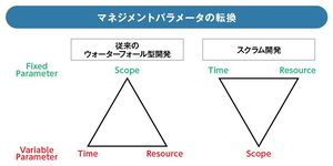 さらに、スクラム開発には「クロスファンクション型の少人数のチーム体制」という最大の特徴がある。サービス企画者とシステム開発者を同じチームに配し、人員規模を最小限にとどめることで、セクショナリズムによって発生する無駄なプロセスを排除し、スピードと品質を高めるという狙いだ。
